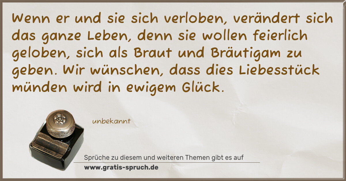Wenn er und sie sich verloben, verändert sich das ganze Leben, denn sie wollen feierlich geloben, sich als Braut und Bräutigam zu geben. Wir wünschen, dass dies Liebesstück münden wird in ewigem Glück.