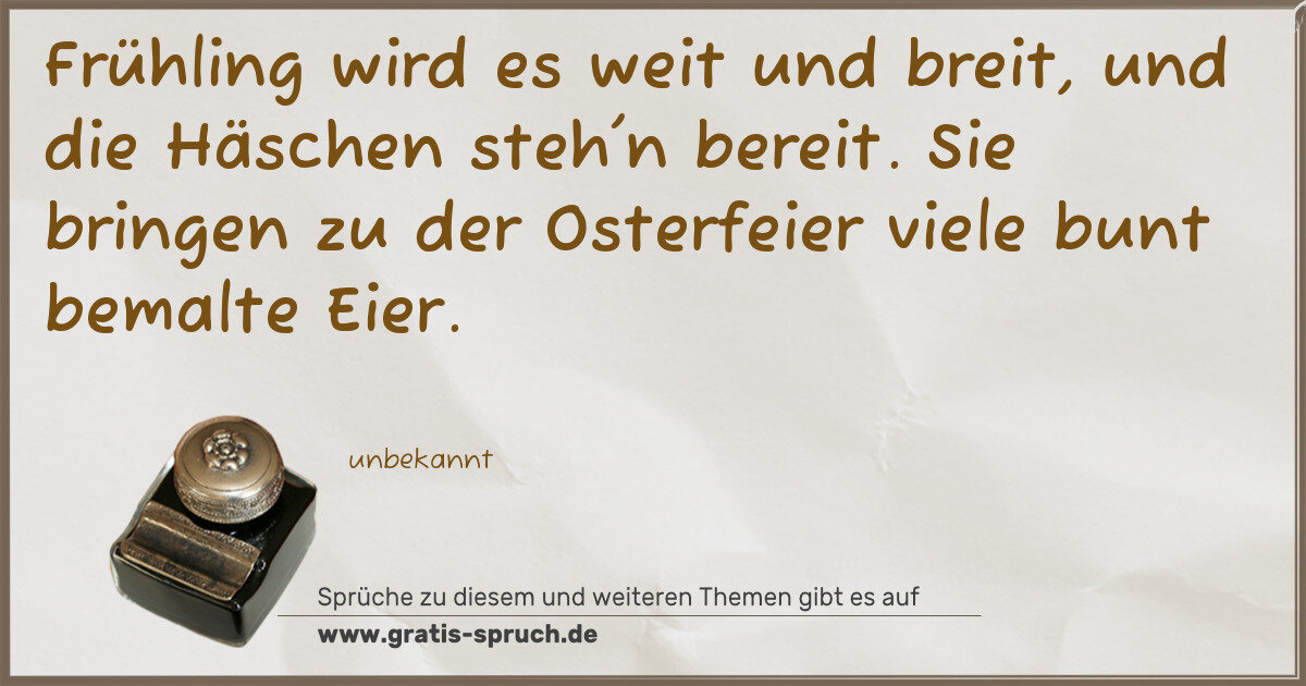Frühling wird es weit und breit, und die Häschen steh'n bereit. Sie bringen zu der Osterfeier viele bunt bemalte Eier.