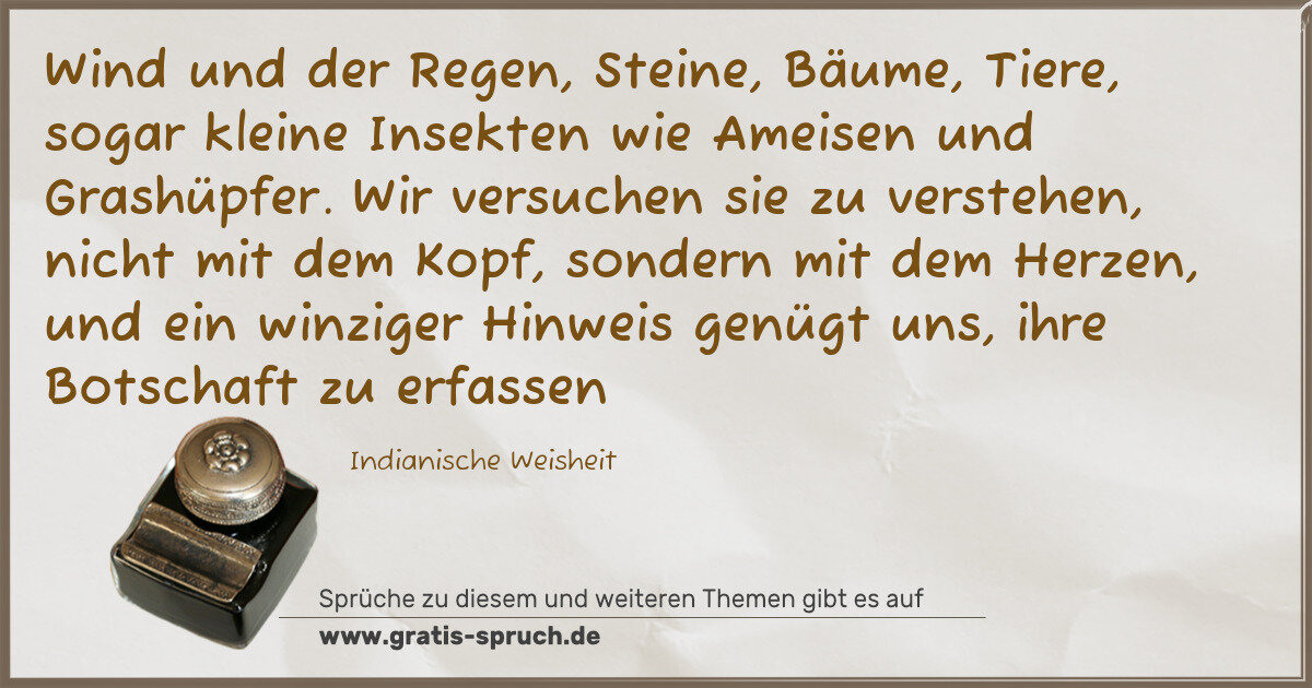 Wind und der Regen, Steine, Bäume, Tiere, sogar kleine Insekten wie Ameisen und Grashüpfer. Wir versuchen sie zu verstehen, nicht mit dem Kopf, sondern mit dem Herzen, und ein winziger Hinweis genügt uns, ihre Botschaft zu erfassen