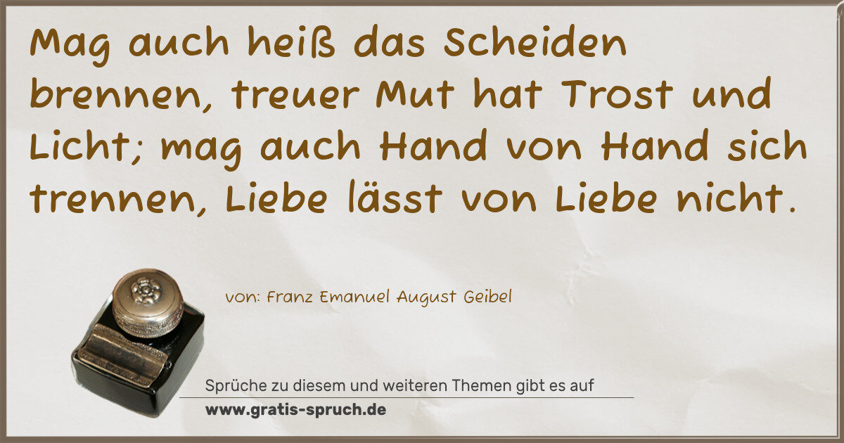 Mag auch heiß das Scheiden brennen, treuer Mut hat Trost und Licht; mag auch Hand von Hand sich trennen, Liebe lässt von Liebe nicht.