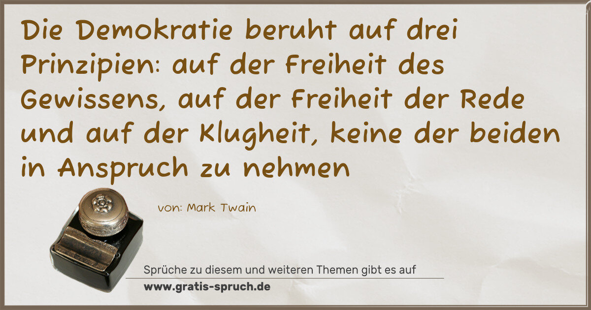 Die Demokratie beruht auf drei Prinzipien: auf der Freiheit des Gewissens, auf der Freiheit der Rede und auf der Klugheit, keine der beiden in Anspruch zu nehmen
