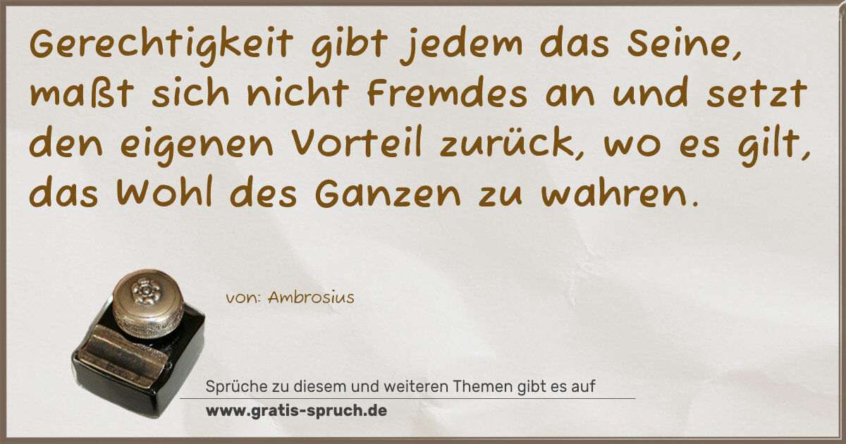 Gerechtigkeit gibt jedem das Seine, maßt sich nicht Fremdes an und setzt den eigenen Vorteil zurück, wo es gilt, das Wohl des Ganzen zu wahren.