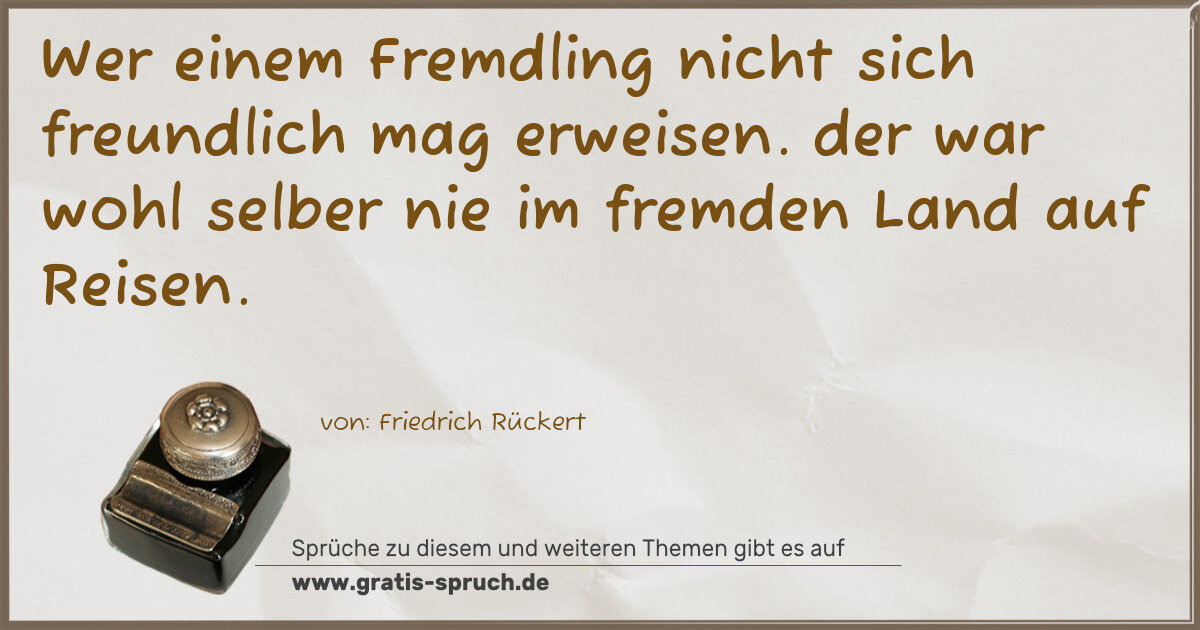 Wer einem Fremdling nicht sich freundlich mag erweisen. der war wohl selber nie im fremden Land auf Reisen.