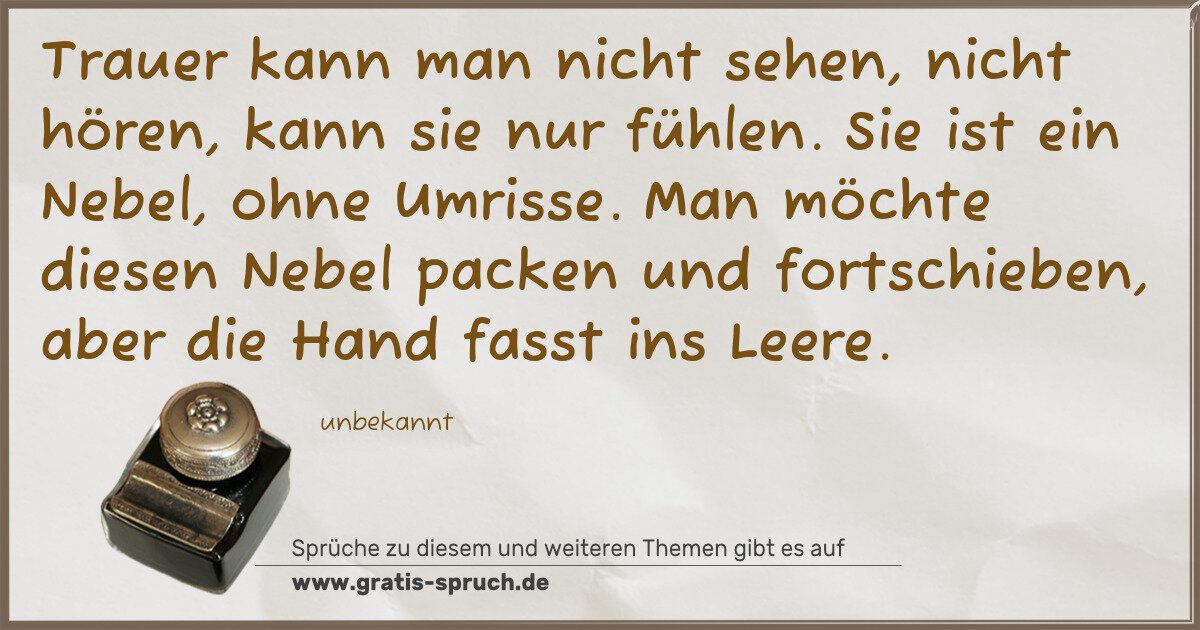 Trauer kann man nicht sehen, nicht hören, kann sie nur fühlen. Sie ist ein Nebel, ohne Umrisse. Man möchte diesen Nebel packen und fortschieben, aber die Hand fasst ins Leere.