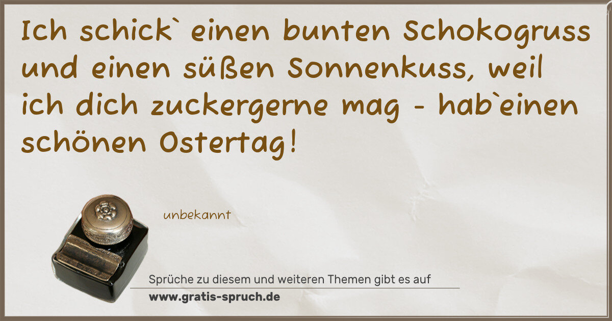Ich schick` einen bunten Schokogruss und einen süßen Sonnenkuss, weil ich dich zuckergerne mag - hab`einen schönen Ostertag!