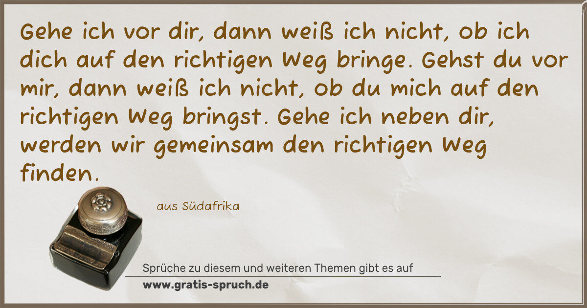 Gehe ich vor dir, dann weiß ich nicht, ob ich dich auf den richtigen Weg bringe. Gehst du vor mir, dann weiß ich nicht, ob du mich auf den richtigen Weg bringst. Gehe ich neben dir, werden wir gemeinsam den richtigen Weg finden.