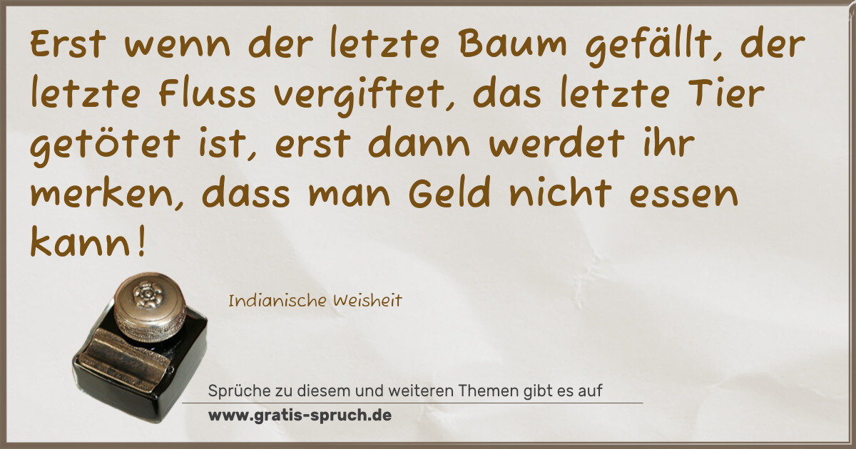 Erst wenn der letzte Baum gefällt, der letzte Fluss vergiftet, das letzte Tier getötet ist, erst dann werdet ihr merken, dass man Geld nicht essen kann!
