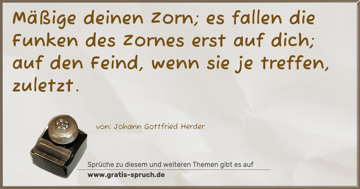 Mäßige deinen Zorn; es fallen die Funken des Zornes erst auf dich; auf den Feind, wenn sie je treffen, zuletzt.